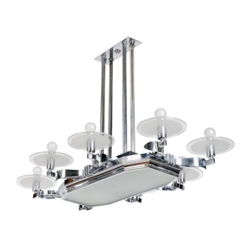 Weißmetall, vernickelt und Glas, partiell mattiert. 8–flammig. Flacher, oktogonaler, an den Kanten profilierter Korpus mit eingelegtem Glasboden. Vom Korpus ausgehend auf jeder Seite paarweise montierte, aus geometrischen Formen zusammengesetzte Arme mit zylindrischen Fassungen und scheibenförmiger, diffuser Abschirmung. Der Korpus zusätzlich mit vier Fassungen. Am Korpus ein montiertes, beidseitig je dreifaches Rundgestänge mit rechteckigem Abschluss. Bajonettfassungen B22. Unsigniert.