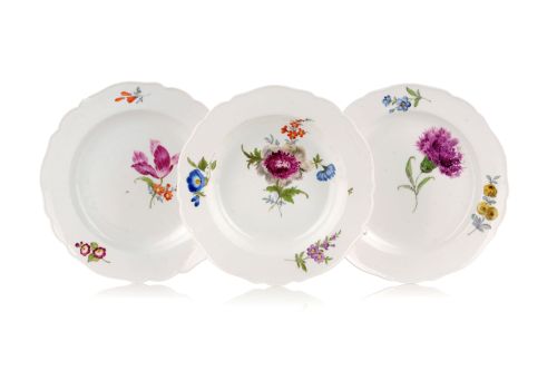 Porzellan, glasiert und in polychromen Aufglasurfarben staffiert. Aus dem Service "Neuer Ausschnitt". Gemuldete Formen mit abgesetzter Fahne und geschweiftem Rand. Die Spiegel mit Blütenbuketts, auf den Fahnen Blütenzweige. Unterseits die Schwertermarken mit Punkt, ein Teller mit vierfach geschliffenen Knaufschwertern, teils geprägte Beiziffern.