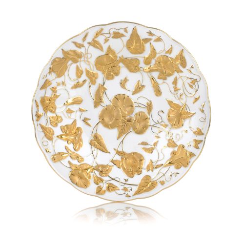 Porzellan, glasiert und in polychromen Aufglasurfarben sowie Goldbronze gefasst. Gemuldete Form mit geschweiftem Mündungsrand. Spiegel und Fahne mit einem reichen, naturalistischen Trichterwinden-Reliefdekor. Unterseits die Schwertermarke mit Punkt in Unterglasurblau, die geprägte Formnummer "C 188", die Drehernummer, die Malerziffer sowie am Standring die Glasurziffer in Unterglasurblau.