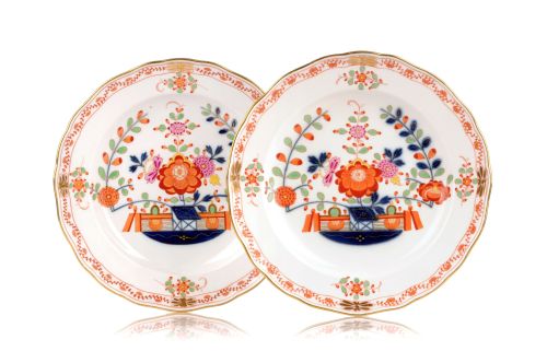 Staffierung im Spiegel partiell minimal berieben. Ein Teller mit retuschiertem Brandfleckchen. Form eines Tellers unregelmäßig.