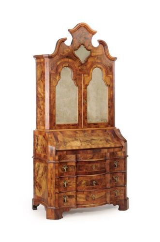 Holz, mit verschiedenen Hölzern mit lebendig gemaserter Textur sowie umrahmend jeweils mit gestreifter Textur furniert. Dreiteiliger, aus Unterschrank, Mittelkorpus und Aufsatz zusammengesetzter, hochrechteckiger Aufbau mit abgeschrägten Seitenkanten auf gesägten Füßen. Der Unterbau dreischübig. Das Mittelteil mit geschweifter, ausklappbarer Schreibplatte. Das Eingerichte mit einem zentralen, mittels Bogenzwickel akzentuierten und verspiegelten Mittelfach, flankiert von jeweils einem Schub. Der Aufsatz zweitürig,