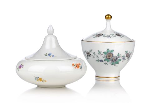 Porzellan, glasiert und in polychromen Aufglasurfarben staffiert sowie partiell gold gefasst. Eine Dose aus dem Kollektivservice. Schalenförmig sowie gedrückt kugelige Formen, die Deckel hauben- und glockenförmig, mit kugel- und zapfenförmigem Knauf. Auf den Wandungen das Dekor "Indische Blumenmalerei in Schwarz, Gold und Grün" sowie "Gestreute Blümchen". Unterseits die zwei- sowie vierfach gestrichenen Schwertermarken in Unterglasurblau. Eine Dose mit Formnummer sowie Drehernummer mit Jahreszeichen.