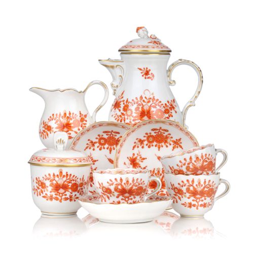 Porzellan, glasiert und in korallenroten Aufglasurfarben staffiert sowie partiell goldgehöht. Neunteilig, bestehend aus Mokkakännchen, Zuckerdose, Sahnegießer sowie drei Tassen mit Untertassen. Aus dem Service "Neuer Ausschnitt", die Zuckerdose nach einem Entwurf von Paul Börner (Entwurfsjahr 1930). Auf den Wandungen das Dekor "Indische Korallenrotmalerei", die Ränder mit Goldfaden. Unterseits jeweils die vierfach geschliffene Schwertermarke in Unterglasurblau, teils mit Modell- sowie Drehernummer mit Jahreszeichen sowie überwiegend das Glasurzeichen.