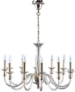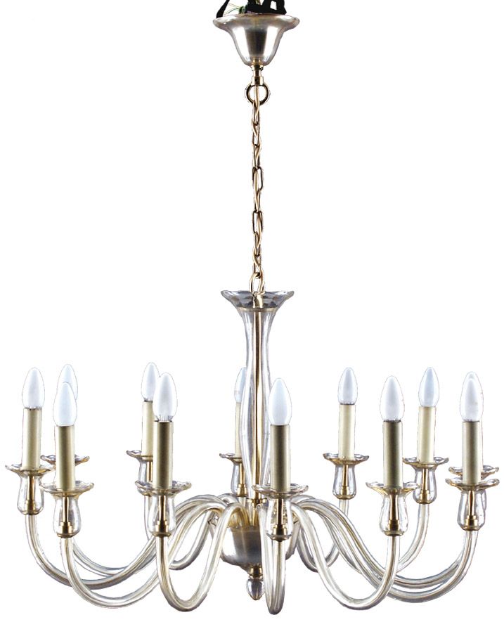Neun geschweifte Glasarme, gebauchter Glasbaluster mit inneliegender Messingstange, Hängung an Kette, in einer Glasrosette endend. Elektrifiziert.