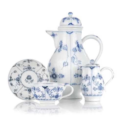 Porzellan, glasiert und in Unterglasurblau staffiert. Auf den Wandungen das Reliefzierat "Gebrochener Stab" sowie das Dekor "Strohblume". Unterseits die Schwertermarken in Unterglasurblau mit Stern, die Tasse mit Knaufschwertern. Teils Prägeziffern sowie Beizeichen in Unterglasurblau.