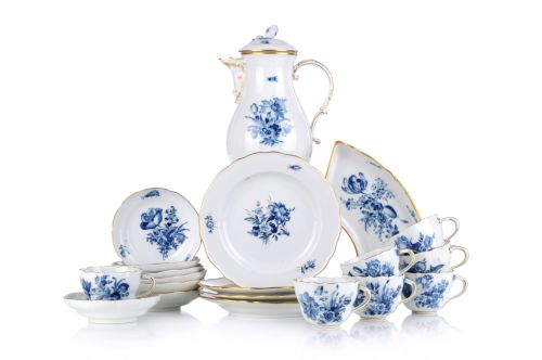 Porzellan, glasiert, in Unterglasurblau staffiert sowie goldgehöht. Aus dem Service "Neuer Ausschnitt". Bestehend aus einer Kaffeekanne, vier Tellern, sieben Tassen mit Untertassen sowie einer Schale aus einer Compotière ("L 197"). Auf den Wandungen das Dekor "Blaue deutsche Blume und Insekten", die Ränder mit Goldfaden. Unterseits die Knaufschwerter mit verschiedenen Prägeziffern sowie die zweifach geschliffenen Schwertermarken in Unterglasurblau mit Formernummer und Jahreszeichen.