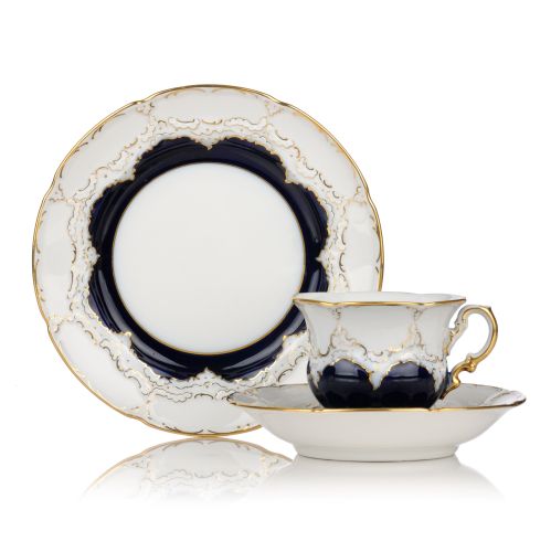 Porzellan, glasiert und in polychromen Aufglasurfarben staffiert sowie mit Aufglasurgold staffiert. Aus dem Service "B-Form". Dreiteilig, bestehend aus Tasse mit Untertasse und Teller. Auf Spiegeln, Fahnen und Wandungen das Dekor "Königsblau glasiert, Gold angespitzt". Unterseits die dreifach geschliffenen Schwertermarken in Unterglasurblau, die geprägten Modellnummern, die Drehernummern mit Jahreszeichen, die Dekornummer sowie das Glasurzeichen.