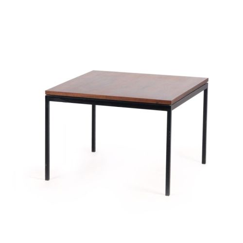 Palisander und Stahl, schwarz lackiert. Quadratische Konstruktion mit Vierkantbeinen, optisch leicht abgesetzte Tischplatten. Ohne Firmenetikett. Maße abweichend zu Firmenkatalog.