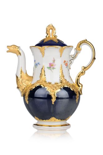 1094 Mokkakanne "Gestreute Blümchen, königsblau glasiert, Goldbronze". Meissen. 1971.