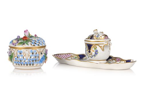 Die Schreibtischgarnitur in Form eines Deckelgefäßes mit Handhaben auf einer passig geschweiften, länglichen Stiftschale. Zylindrischer Tintenfasseinsatz. Wandung und Spiegel mit einem reichen Gitterwerk- und Rankendekor. Unterseits bzw. die Manufakturmarken in Unterglasurblau sowie die gestempelten Formnummern mit den Former-Buchstaben, jeweils mit Malerziffer.