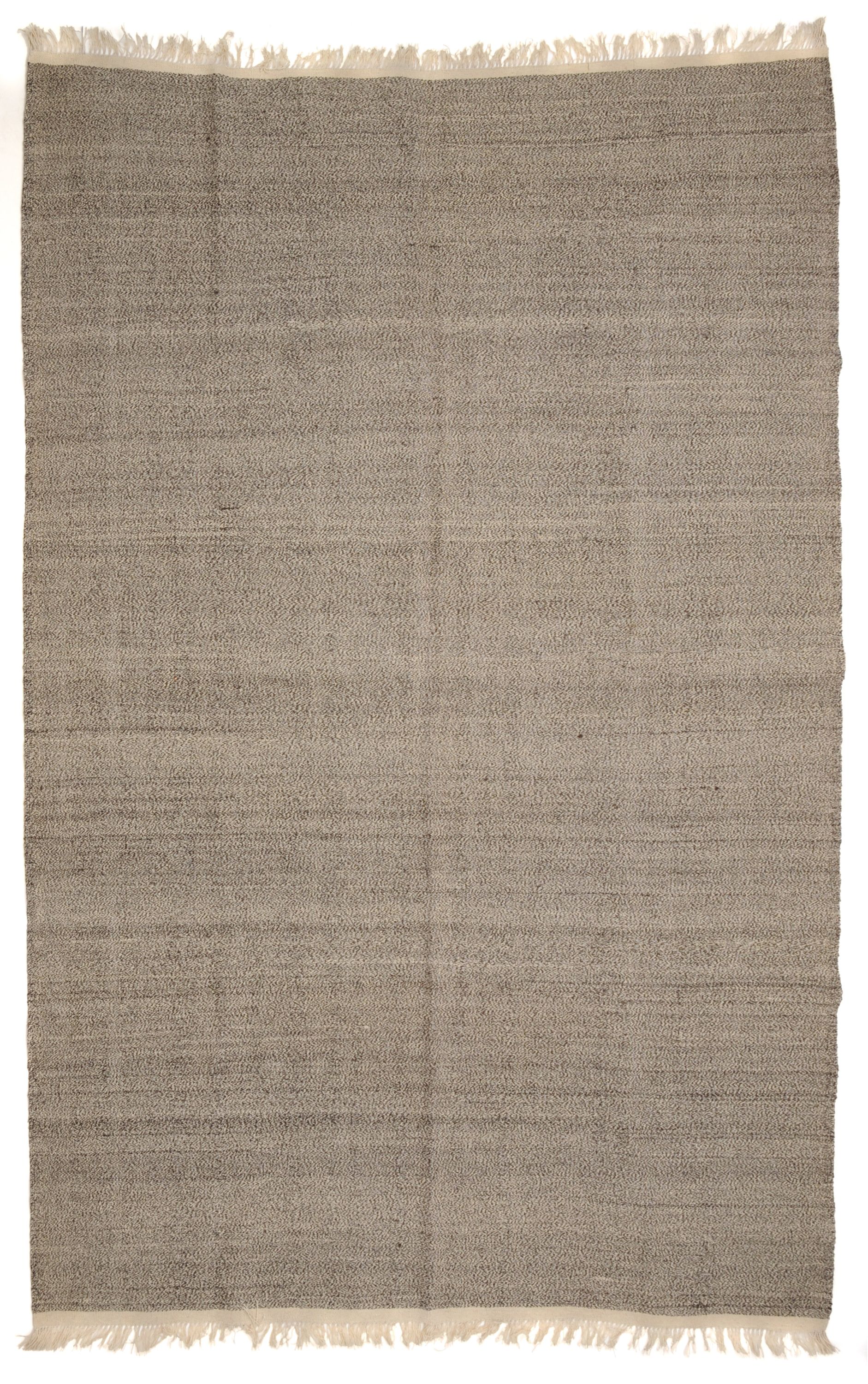 Wolle auf Wolle, Kurzflor. Flächige Strukturierung in changierend sandfarben-dunkelbrauner Farbgebung. Flache Kante, Fransen in Wollweiß.