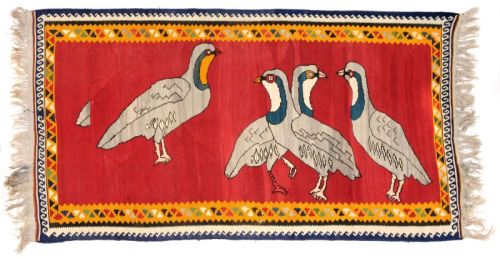 Wolle auf Wolle, Flachgewebe. Intensiv rotes Innenfeld mit vier Vögeln. Zweifache Bordüre mit gegenläufigen Dreiecksmotiven sowie mit laufendem Hund. Farbgebung in Orangegelb, intensivem Rot, Dunkelblau, Wollweiß, Grau und Grüntönen. Flache Kante, Fransen in Wollweiß.