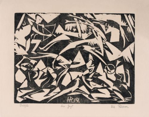 Holzschnitt auf Bütten. Im Stock ligiert monogrammiert "HR" und datiert u.Mi. Unterhalb der Darstellung in Blei re. signiert "Hub. Rüther", Mi. betitelt und re. bezeichnet "Selbstdr.". Hinter Glas im schwarzen Wechselrahmen gerahmt.