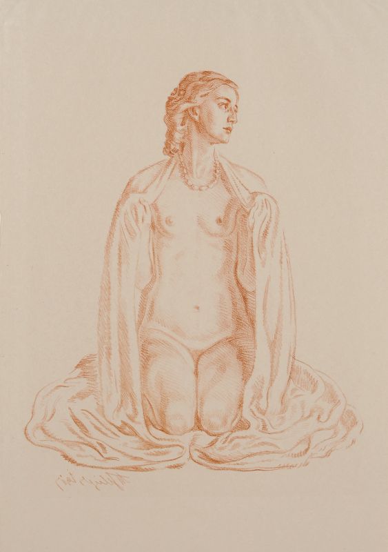 Kreidelithografie in Rotbraun auf festem Japan. Im Stein u.li. spiegelverkehrt signiert "M Seliger". Am oberen Blattrand vollständig im originalen Passepartout mit dem Trockenstempel "Freunde Graphischer Kunst e.V. Leipzig" u.Mi. montiert. Blatt drei der "V. Jahresgabe der Freunde Graphischer Kunst 1917", hrsg. von der Vereinigung zur Förderung der Original-Graphik, Leipzig. Passepartout verso u.li. von fremder Hand in Blei künstlerbezeichnet, betitelt, orts- und technikbezeichnet.
