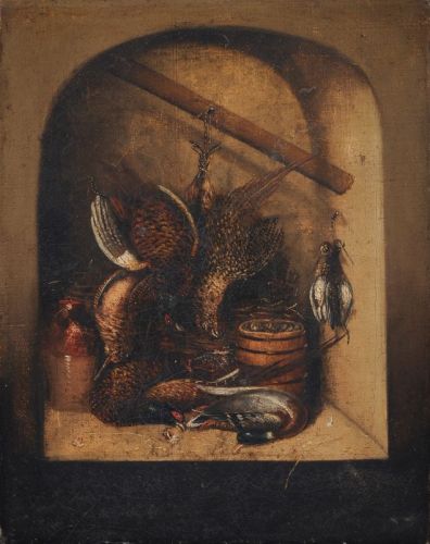 014 Unbekannter Künstler, Küchenstück mit Rebhühnern, Fasanen, Bekassinen und einer Ente. 19. Jh.
