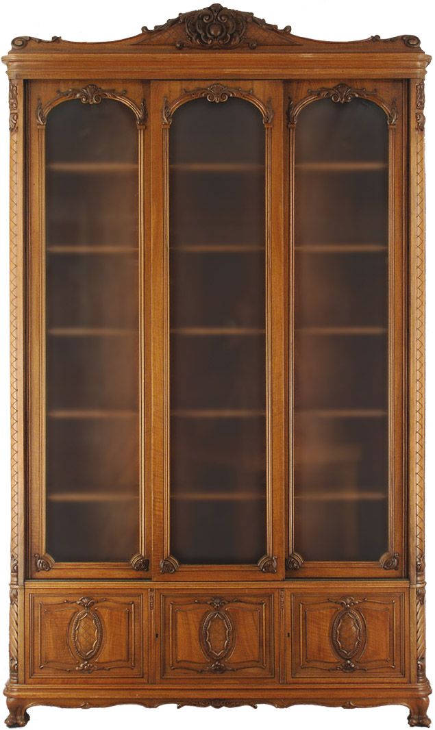 Nussbaum auf Eiche furniert. Fester Vitrinenaufsatz, drei verglaste Schiebetüren. Unterschrank geschlossen, dreitürig, mit Schnitzdekor auf den Türen. Giebelbekrönung mit geschnitzter Kartusche und Rollwerk. Regalfächer mit flexiblem Stecksystem. An der rechten Innentür kleines Schild des Herstellers: Rudolf Bagier& Comp. Hoflieferanten. Dresden - A. Seestraße 6.