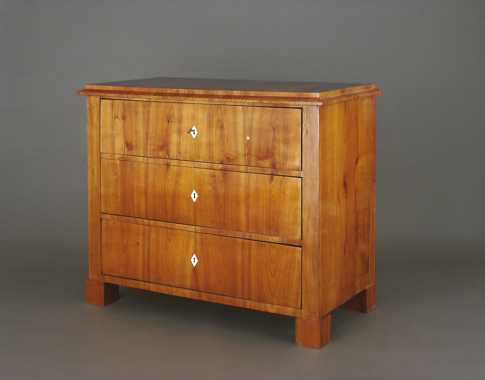 Kirsche auf Weichholz furniert. Dreischübig. Gerader Aufbau. Schlüsselschilder in Bein eingelegt in Wappenform. Diverse Beschädigungen am Furnier.