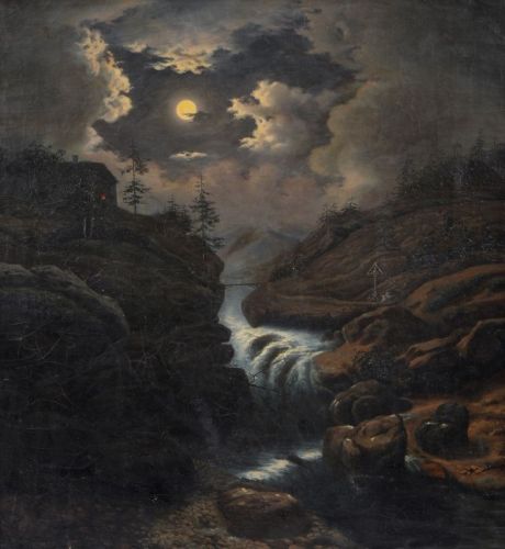 Nicht jedem Künstler gelingt eine Landschaftsdarstellung, in der Großteile des Motivs von der Finsternis der Nacht beherrscht werden. Durch feinste Nuancierungen in der Farbigkeit bekommt der Betrachter dennoch ein Gefühl für die Schroffheit der felsigen Umgebung und die Kühle des tosenden Wassers. Und plötzlich entdeckt man auch die kleine Lichtquelle, die von dem strohgedeckten Haus ausgeht und Wärme und Behaglichkeit verspricht.