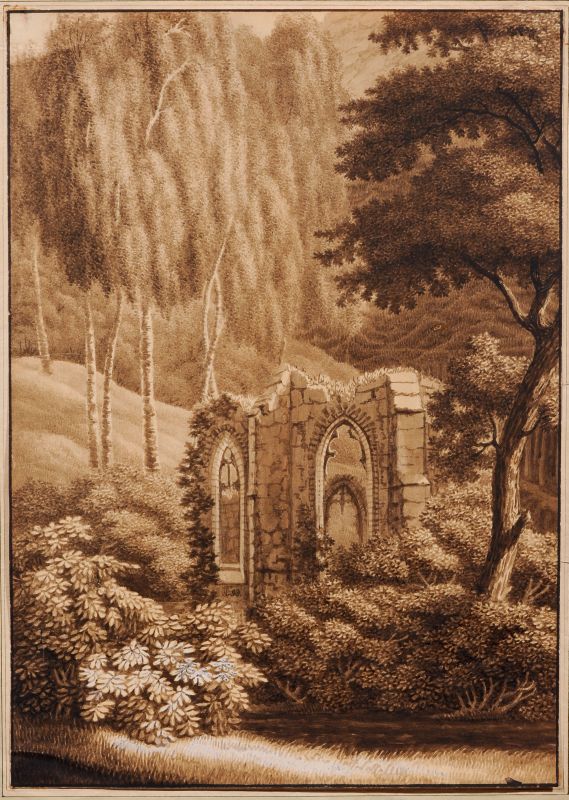 151 Johann Friedrich Wizani (Umkreis), Ruine in einer Parklandschaft. Wohl 1798.