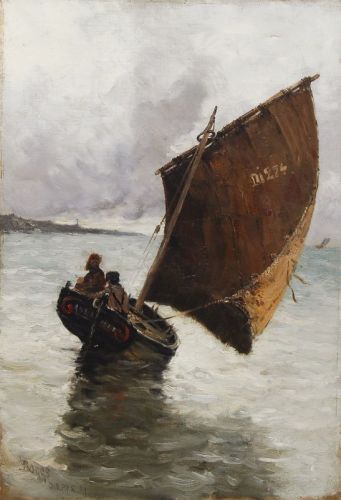 Typisches Werk der Frühphase der französischen Marinebilder von Boggs - in dunklen Ocker- und Grautönen wird die Ausfahrt des kleinen Segelschiffs bühnenartig vor dem Hintergrund des sich verdüsternden Himmels inszeniert.
