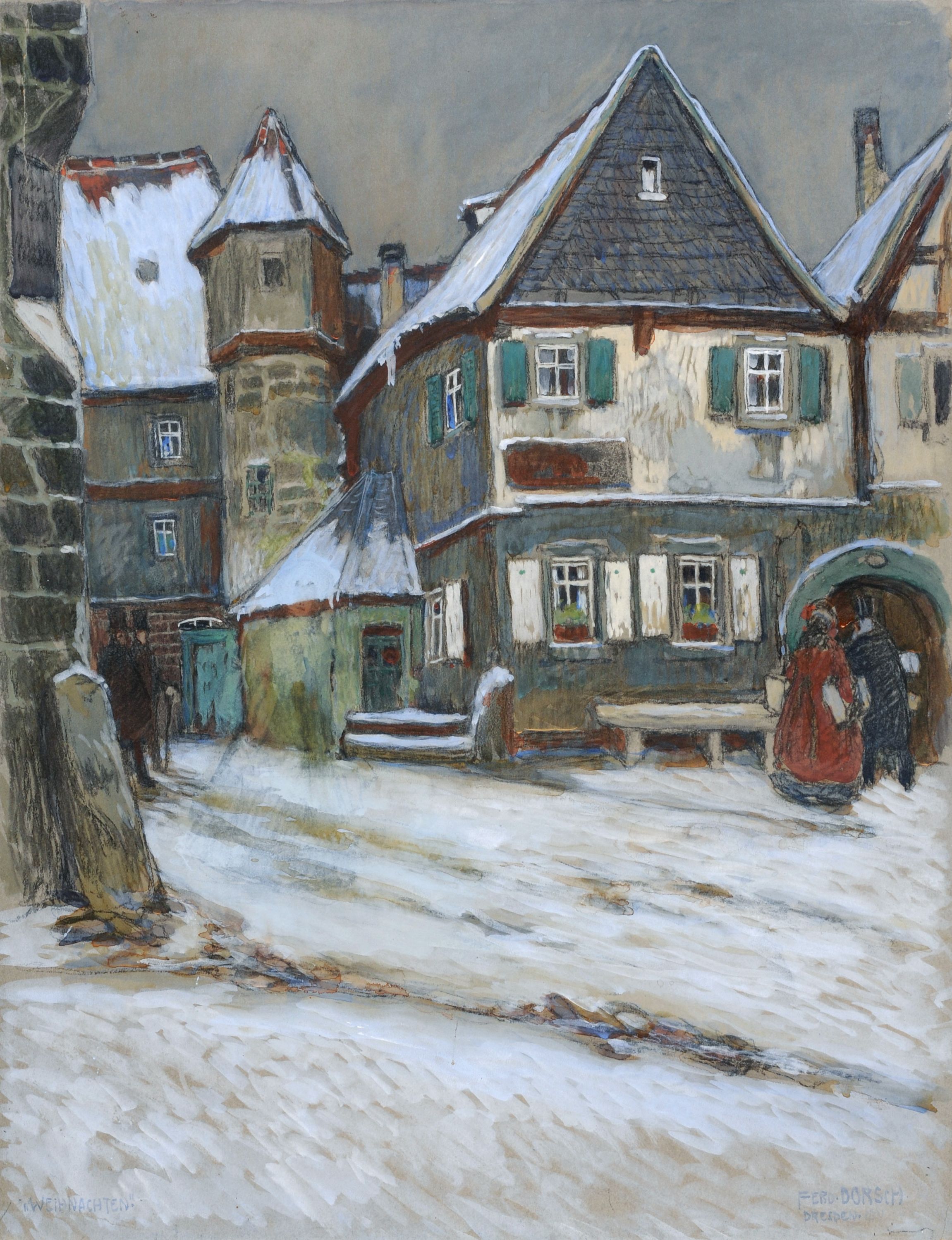 Aquarell und Kohlestiftzeichnung auf grauem Papier, auf eine kräftige Malpappe kaschiert. Signiert "FERD. DORSCH" und bezeichnet "Dresden" sowie undeutlich datiert u.re., u.li. betitelt. Hinter Glas in einer weiß lackierten Leiste mit Eckdekor gerahmt..