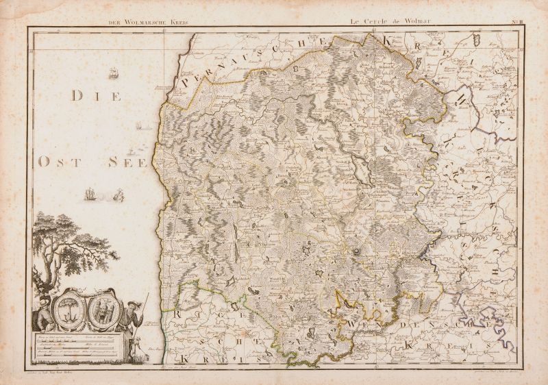 Kupferstich, grenzkoloriert. Li.u. mit figürlicher und floraler Wappenkartusche mit Stadtsiegel und Stadtwappen von Wolmar sowie Maßstab liefländischer und deutscher Meilen. In der Platte bezeichnet "gezeichnet von Lud. Aug. Graf Mellin" u.li. und "gestochen von Carl Jäck in Berlin u.re. O.re. nummeriert "No.III". Aus "Atlas von Liefland oder von den beyden Gouvernementern u. Herzogthümern Lief- und Ehstland und der Provinz Oesel", No. 3, Riga nach 1791. Vollrandig auf Untersatzkarton montiert.