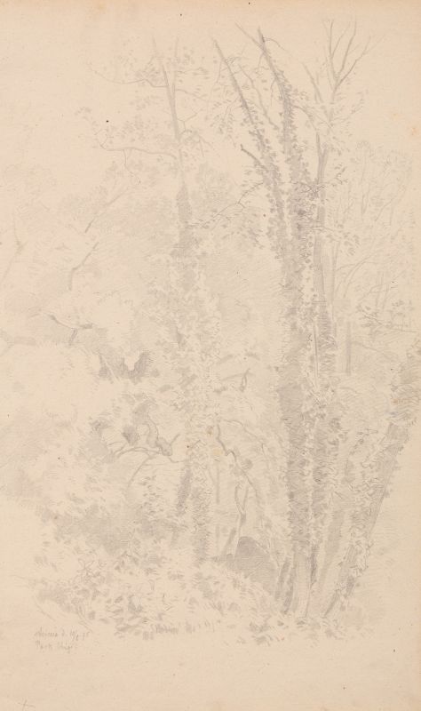 Bleistiftzeichnung auf Bütten. Unsigniert. In Blei von Künstlerhand bezeichnet "Ariccia d. 10/5 75" und "Park Chigi" u.li. Verso in Blei von fremder Hand bezeichnet "Aus Louis Neuberts Skizzenbuch" u.Mi.