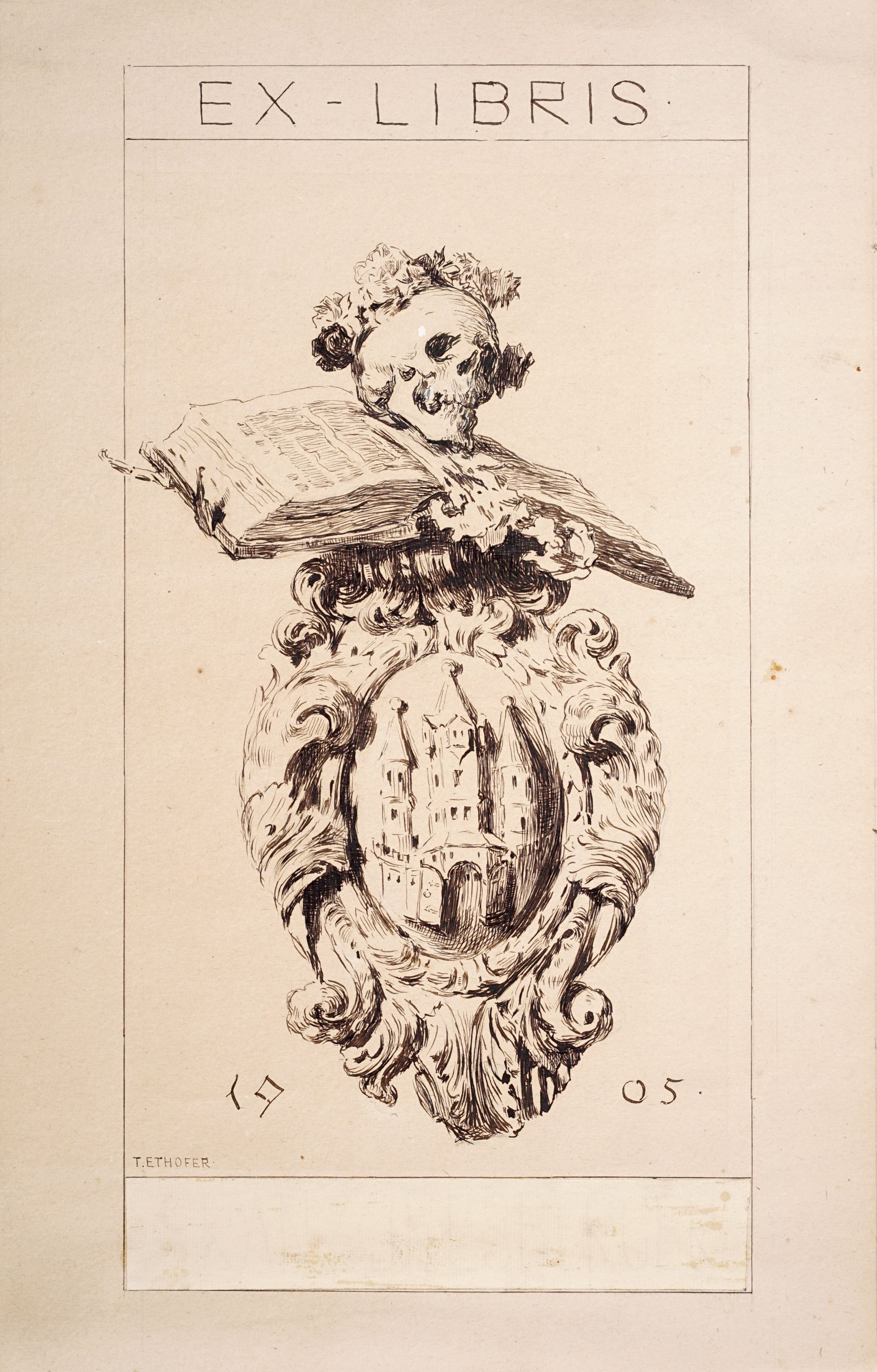 180 Theodor Josef Ethofer, Exlibris – Memento mori mit Buch und Totenschädel. 1905.