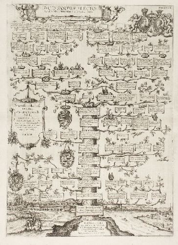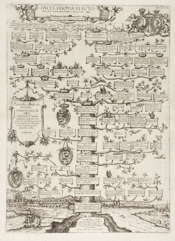 Stammbaum der Wettiner Fürsten mit Ansicht von Dresden. Fol. XXXI. Kupferstich.Am oberen und linken Blattrand Knickspuren.