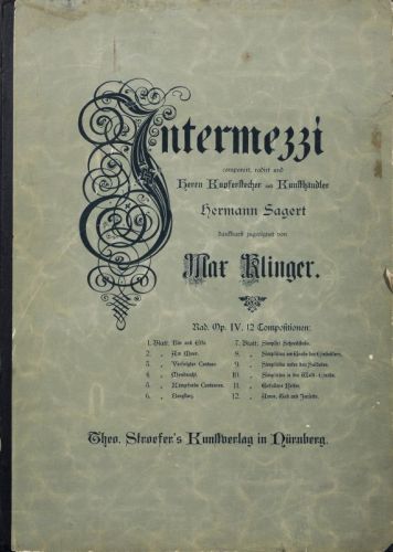 Aquatintaradierungen auf China, auf Bütten aufgewalzt. Mappe mit 12 Arbeiten "Bär und Elfe"; "Am Meer"; "Verfolgter Centaur"; Mondnacht"; "Kämpfende Centauren"; "Bergsturz"; "Simplici Schreibstunde"; "Simplicius am Grabe des Einsiedlers"; "Simplicius unter den Soldaten"; "Simplicius in der Wald-Einöde"; "Gefallene Reiter"; "Amor, Tod und Jenseits". Alle Grafiken in der Platte signiert "Max Klinger" u.li. sowie nummeriert u.re. Gedruckt bei Theo Stroefer´s Kunstverlag in Nürnberg. Auf dem Mappendeckel bedruckt ausführlich betitelt.