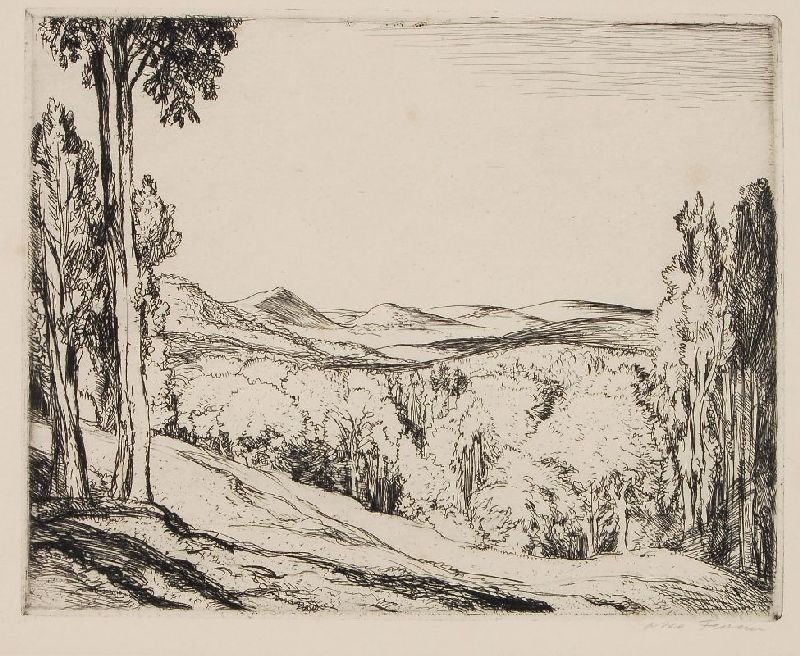 Radierung. Unterhalb der Darstellung in Blei signiert "Otto Fischer" u.re. Blatt vergilbt und mit stärkeren Knickspuren im Randbereich. Stockfleckig. Unterer Rand mit zwei Einrissen.