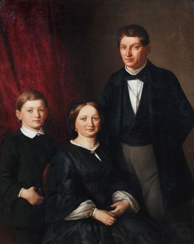 Öl auf Leinwand. Signiert "Anton Weber" und datiert u.re. Verso auf dem Keilrahmen altes Papieretikett mit Betitelung und ausführlicher Bezeichnung "Posthalter Carl Müller/ Gasthofbesitzer vom goldenen Helm/ zu Lichtenstein mit/ Frau u. Sohn/ Hertha Müller geb. Heppe/ Carl Müller jun.". In einem reich verzierten, goldfarbenen Stuckrahmen gerahmt. Dieser rückseitig mit aufgeschraubten Leisten stabilisiert.