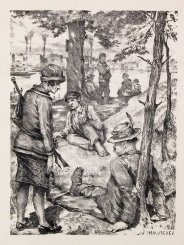 Lithographie. Im Stein signiert "HBaluschek" u.re. Auflage für die Deutsche Bildkunst-Hilfe e.V., Leipzig. Verso auf einem Etikett Bildbeschreibung des Vereins. Im Passepartout.