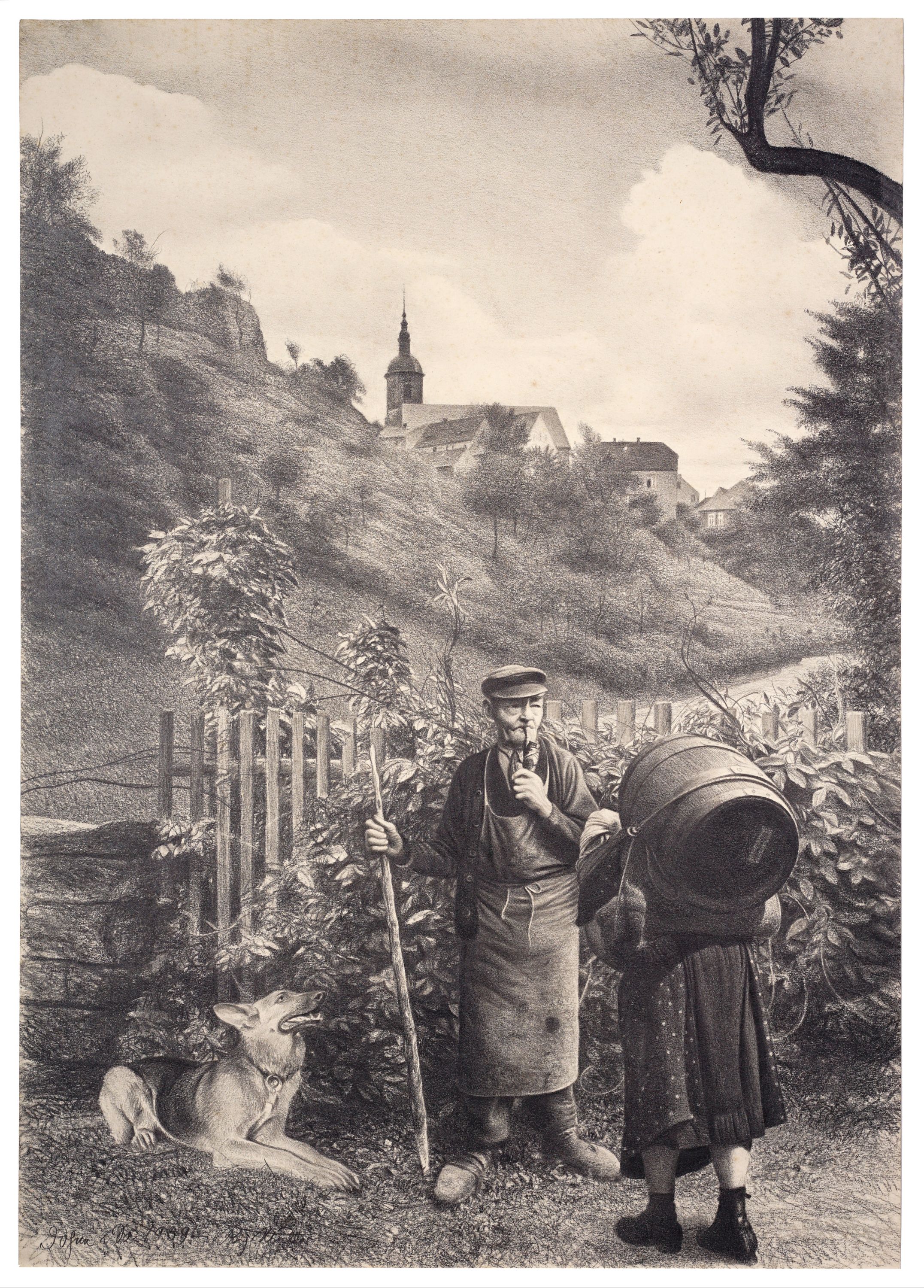 232 Richard Müller "Bauernpaar mit Hund in Dohna" (Blick auf die Marienkirche). 1939.