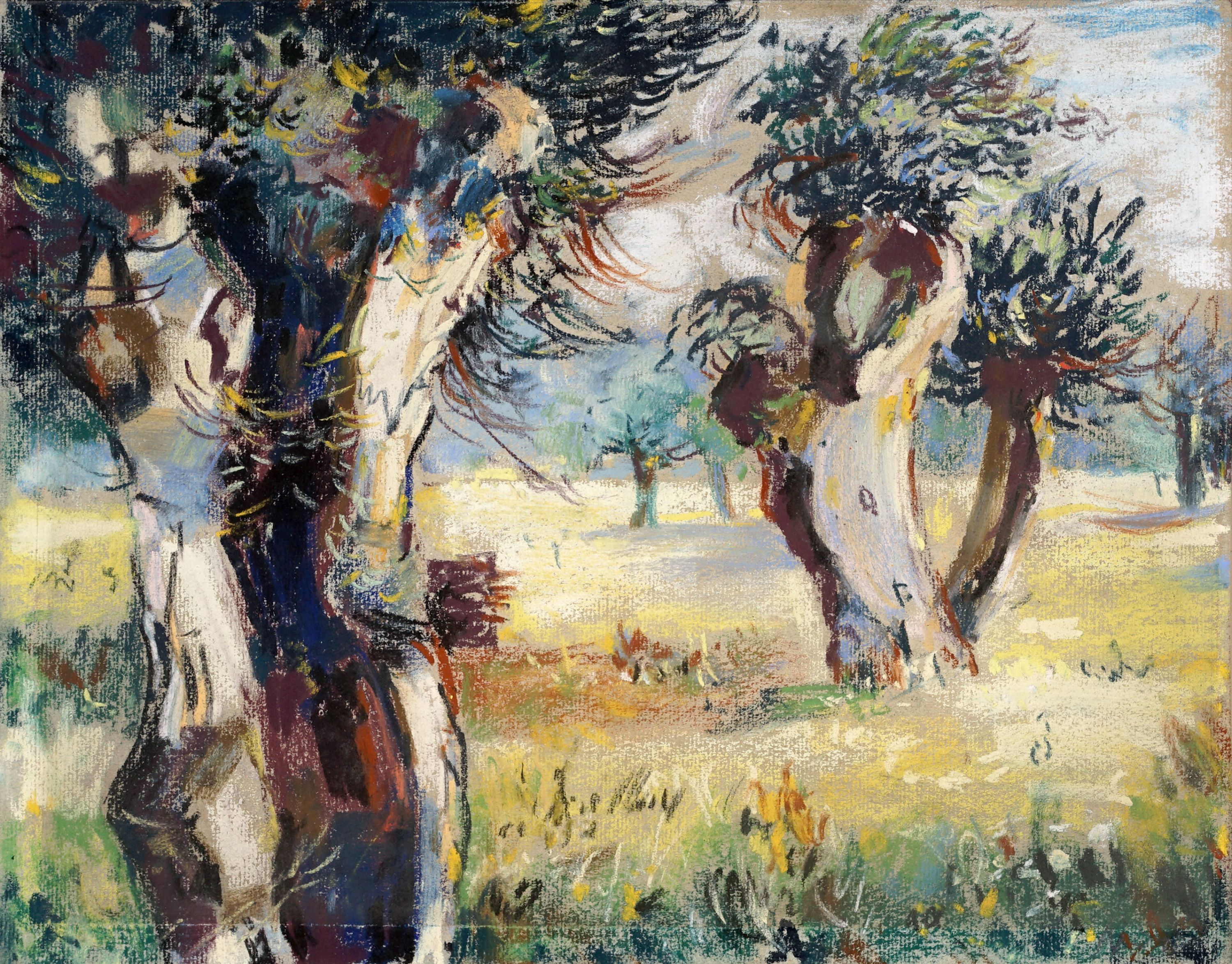 Farbige Pastellkreidezeichnung auf blaugrauem Maschinenbütten, unfixiert. Unsigniert, datiert u.Mi. Verso in Blei bezeichnet "Weidenfolge in …hofen bei .. (?) 6. Blatt". Im Passepartout hinter Glas in Gold gefasster, profilierter Holzleiste gerahmt.