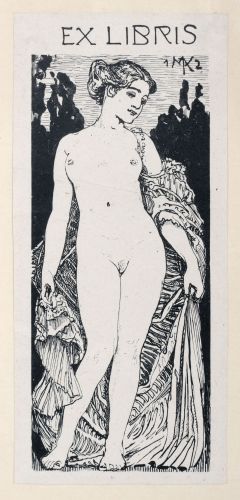 Holzschnitt auf feinem Papier. Im Stock o.re. ligiert monogrammiert "MK" und datiert sowie o.Mi. bezeichnet "EX LIBRIS". Geschnitten von Naumann (oder Geßner). An den oberen Ecken auf Untersatz montiert.