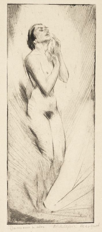 Radierung. In Blei unterhalb der Darstellung signiert u.re., u.li. und mittig unleserlich bezeichnet.Blatt gleichmäßig leicht gebräunt, Knickfalte am linken Rand.