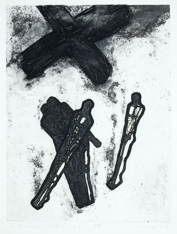 Aquatintaradierung auf Hahnemühle-Bütten. In Blei datiert und signiert "Morgner" u.re., betitelt u.re., nummeriert 22/50 II u.Mi. Kleiner Wasserfleck am äußeren unteren Blattrand.