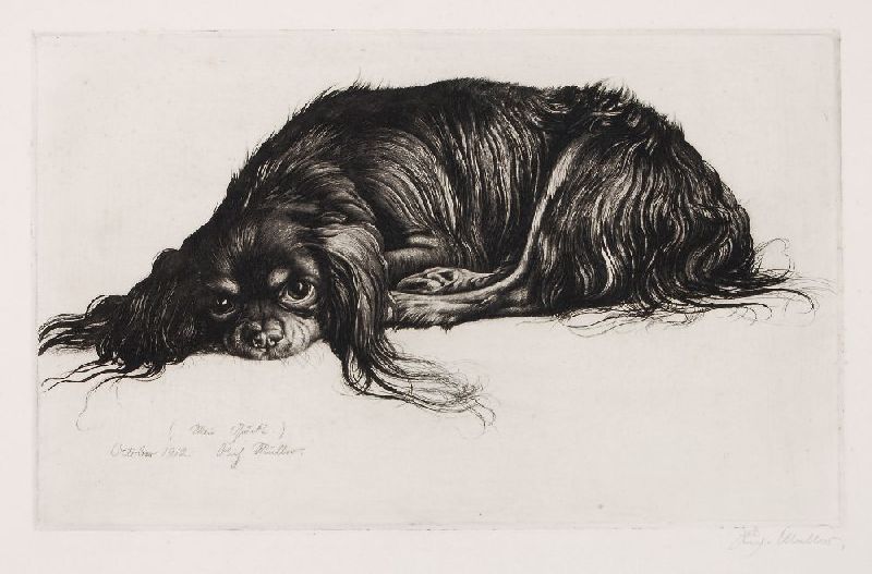 Radierung in Schwarzbraun mit Tonplatte. In der Platte bezeichnet "Rich. Müller", betitelt "Mein Quick" und datiert "October 1912" u.li. In Blei außerhalb der Darstellung u.re. signiert "Rich. Müller". Zahlreiche Stockflecken und Knickspuren am rechten Bildrand. Im Passepartout. WVZ Günther 67.