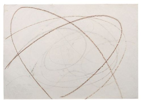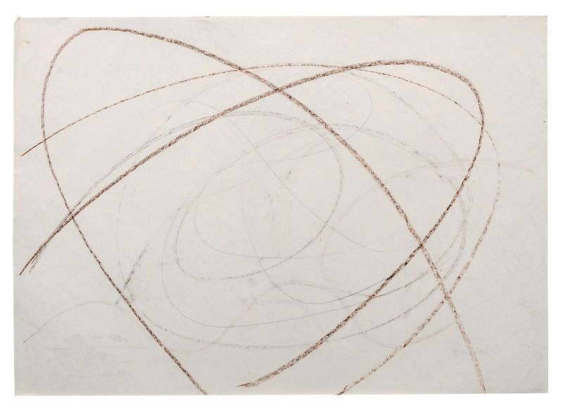 Kreidezeichnung in Braun (Kerze und Wachsstift) auf wolkigem Bütten. Unsigniert. Verso ausführlich datiert "18.11.1983 / 17.36 / Freitag", technikbezeichnet sowie bezeichnet "traurig". Von fremder Hand u.li. in Blei mit der Nachlaß-Nr. "3091" bezeichnet.