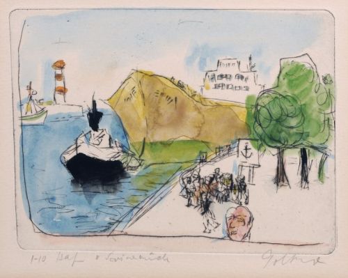 Kaltnadelradierung, aquarelliert. Unterhalb der Darstellung re. in Blei signiert "Goltzsche", li. nummeriert "1-10" und betitelt. Umlaufend mit Klebeband im Passepartout montiert. Hinter Glas in brauner Holzleiste gerahmt.
