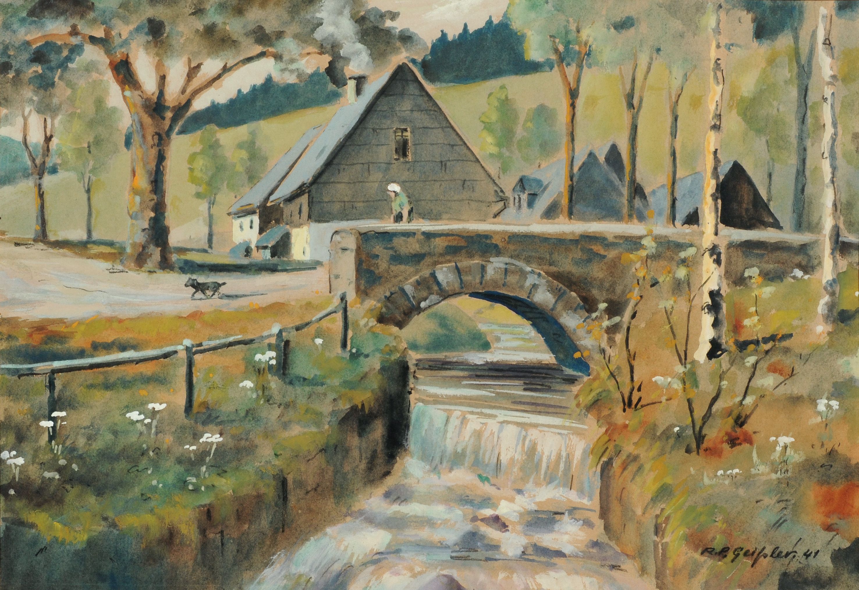 Aquarell, Kohlestiftzeichnung und Deckweiß auf braunem Papier. Signiert in Kohle u.re. "R.P. Geißler" und datiert. Im einfachen Passepartout in einer hellen Holzleiste hinter Glas gerahmt.