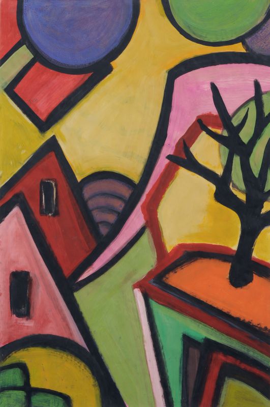 404 Fritz Keller, Landschaft mit Häusergiebeln und Baum. Wohl 1980er Jahre.