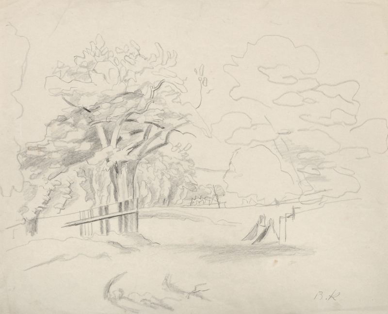 408 Bernhard Kretzschmar, Baumbestandene Landschaft mit Gartenzaun. Ohne Jahr.