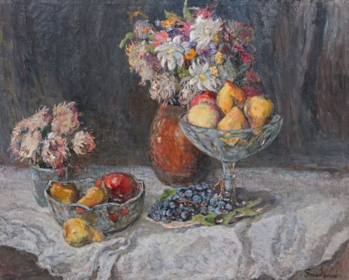 041 Walter Friederici, Stilleben mit Früchten und Sommerblumenstrauß. Ohne Jahr.