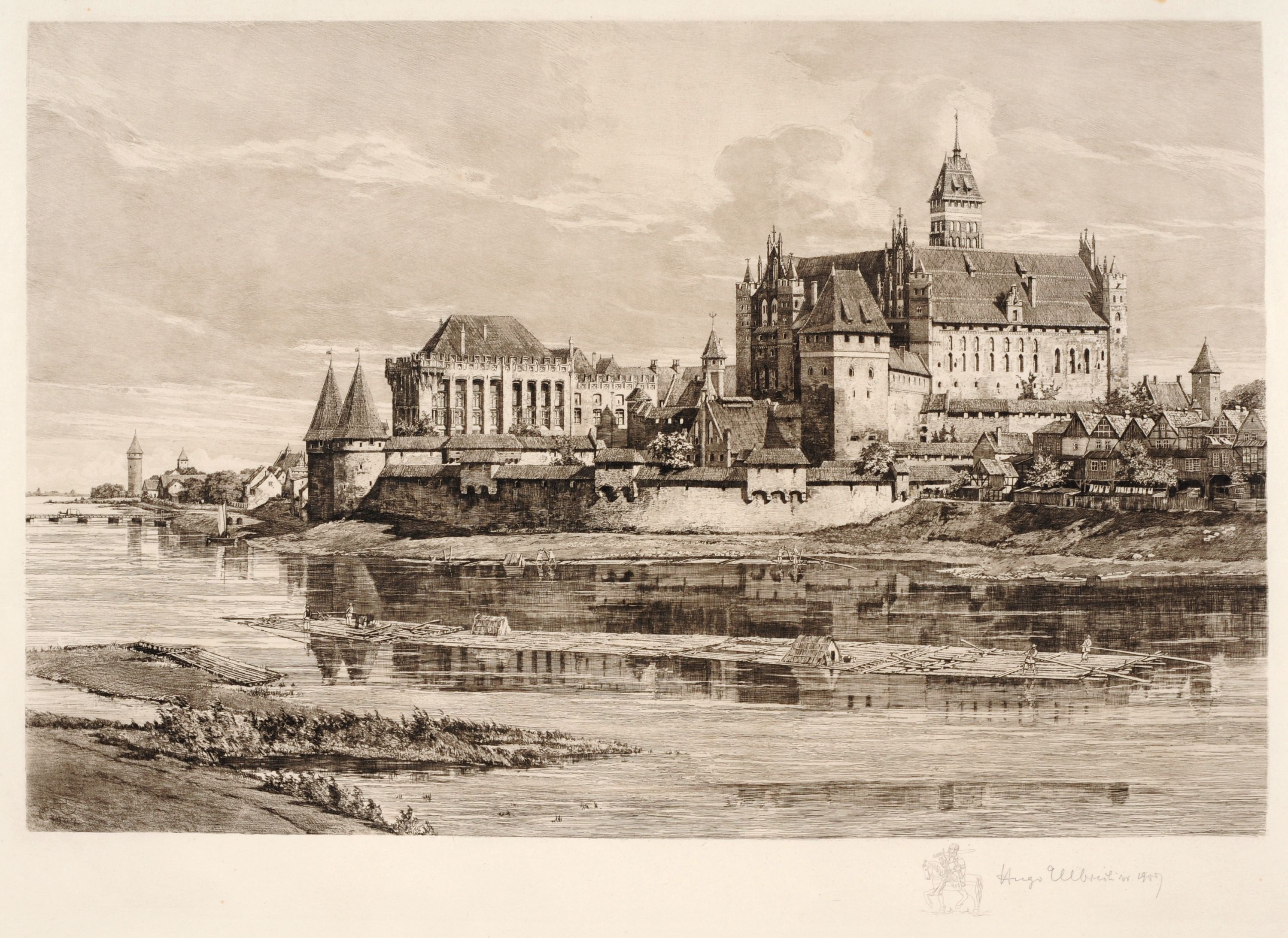 Dargestellt ist die Ordensburg des Deutschritterordens bei Danzig, von der Nogat aus gesehen.
