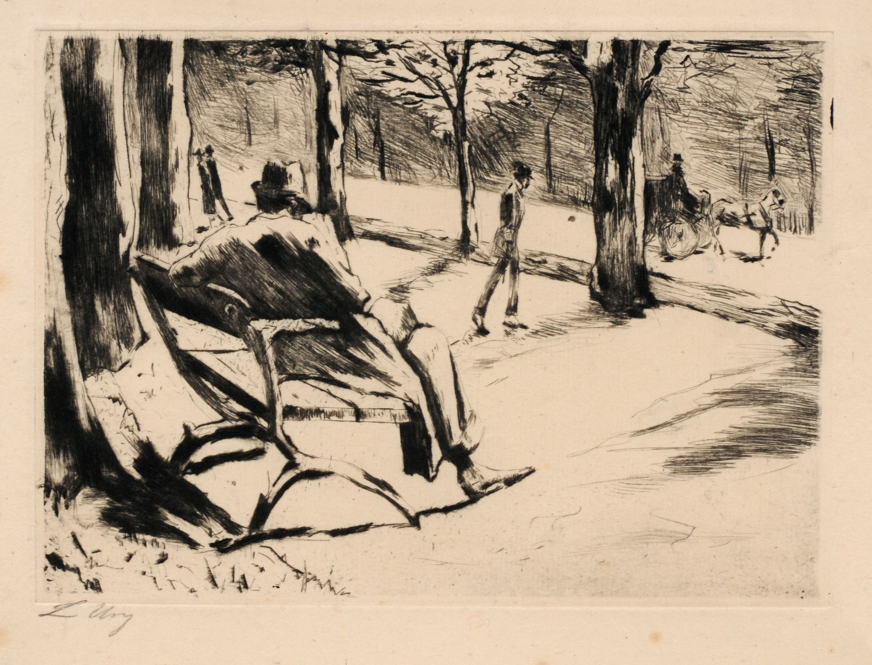 417 Lesser Ury "Zeitungsleser mit Filzhut im Tiergarten". 1922.