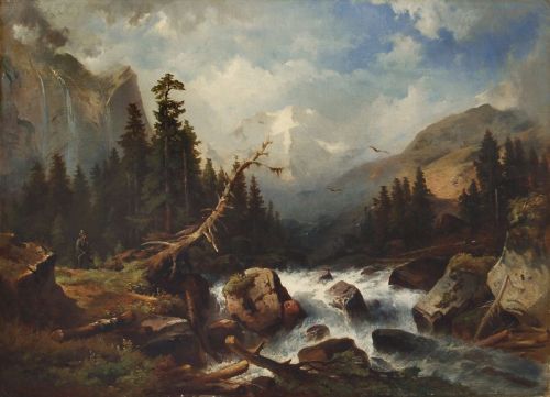 Akademische Landschaftsszene, in der die wilde Schönheit der unberührten, rauhen Alpennatur auf dramatische Weise inszeniert wird.