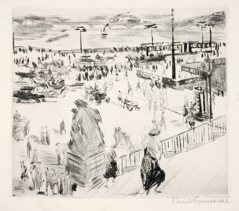 Radierung auf chamoisfarbenem Papier. In Blei signiert "Paul Paeschke". Im Passepartout. Blattränder minimal knickspurig und berieben. Jeweils ein kleiner Einriss (1 cm) am oberen und unteren Blattrand. Verso winzige Fleckchen.