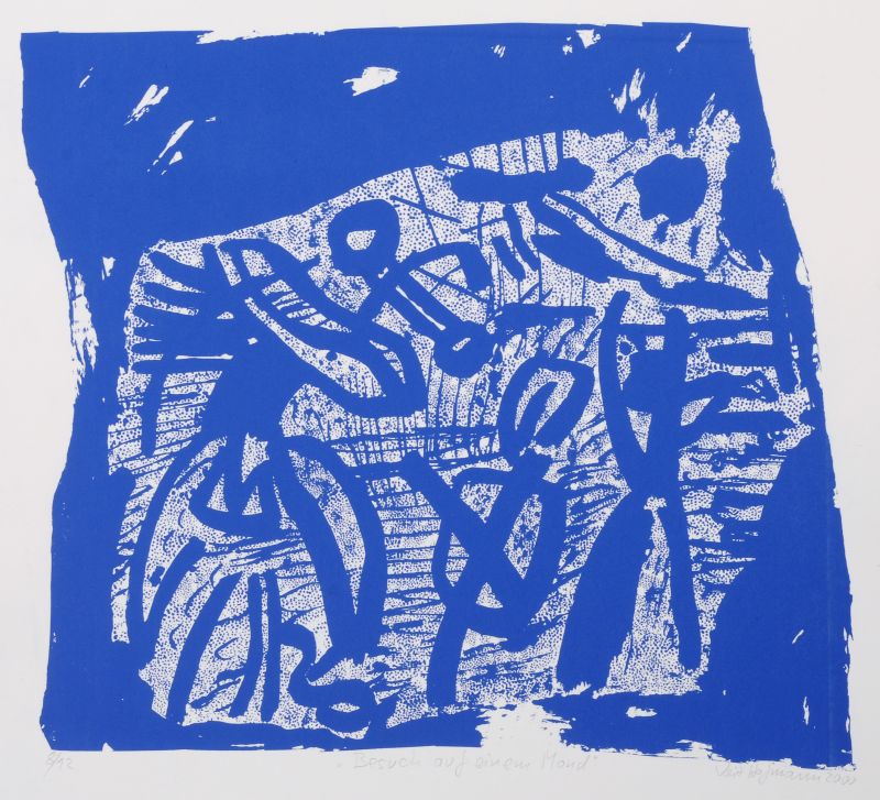 Farbserigraphien auf kräftigem "Rives"-Bütten. "Blauklang" in Blei unterhalb der Darstellung re. ligiert monogrammiert "VH", Mi. betitelt sowie li. nummeriert "19/20". "Besuch auf einem Mond" in Blei unterhalb der Darstellung re. signiert "Veit Hofmann", Mi. betitelt sowie li. nummeriert "8/12".